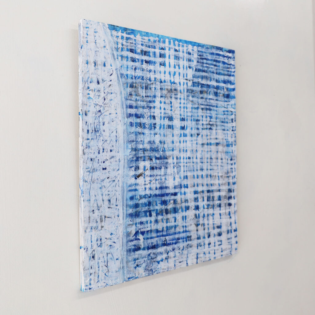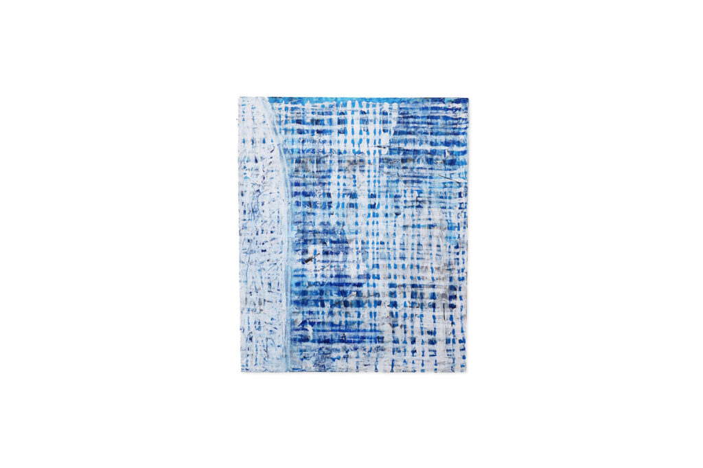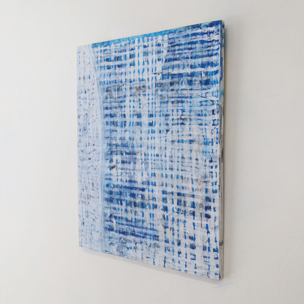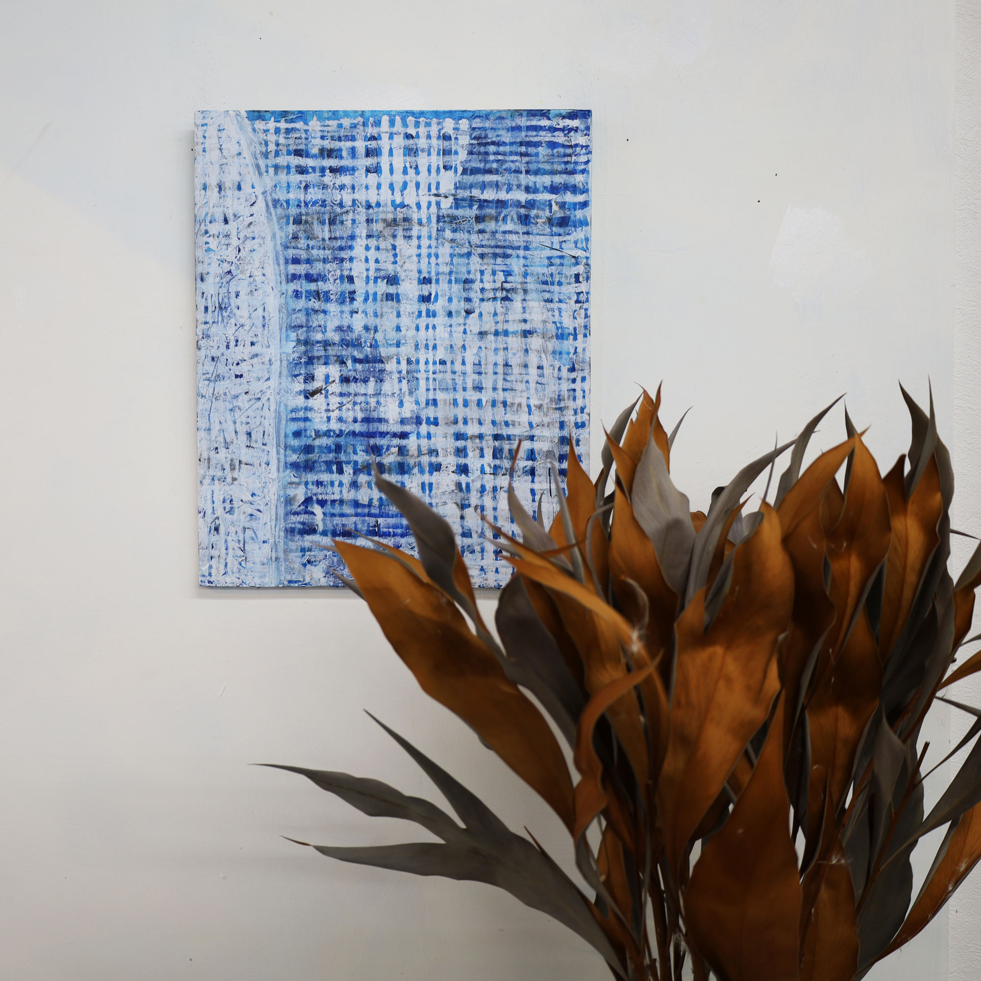 A wandering path that eventually revealed a soft, shimmering check pattern. Vertical blue lines, left to flow naturally, meet horizontal white lines drawn by hand with crayon. In these unsteady, hand-drawn intersections, I feel a sense of gentle comfort and tranquility.