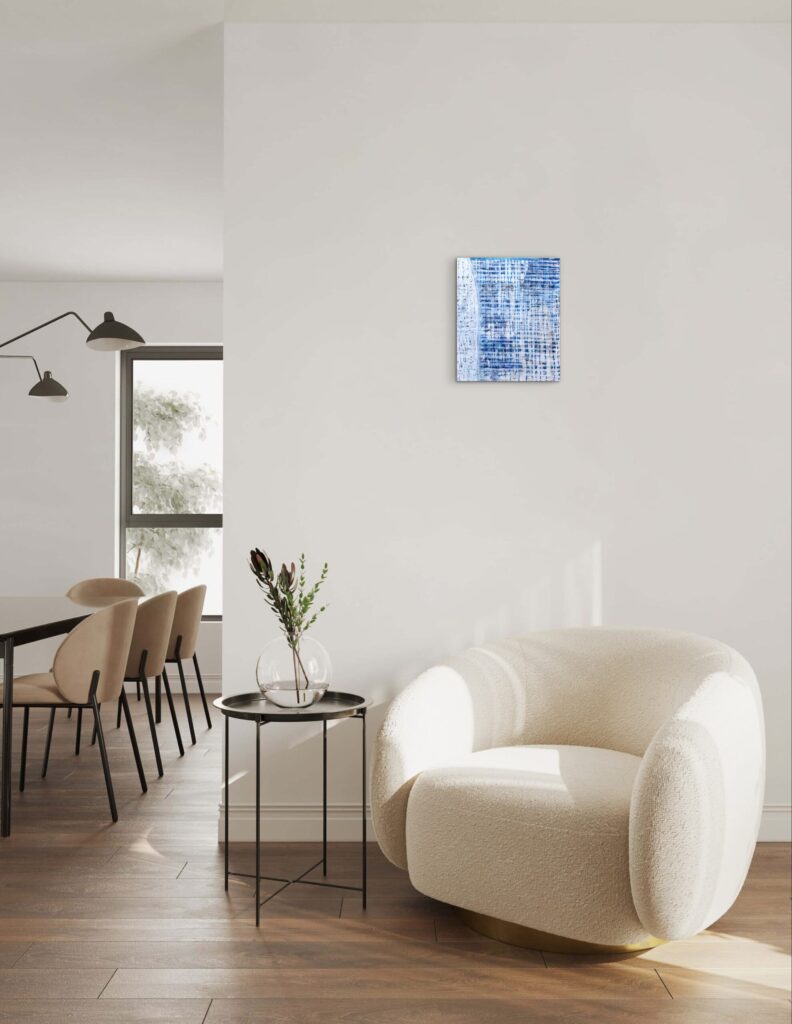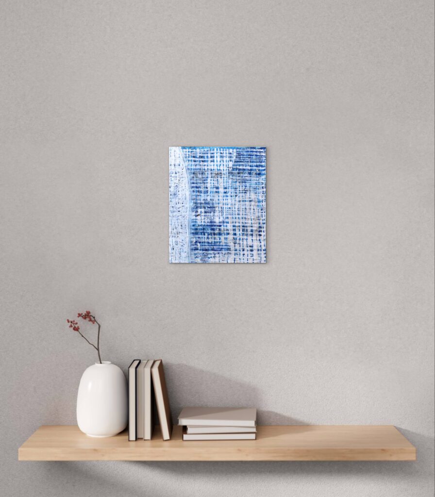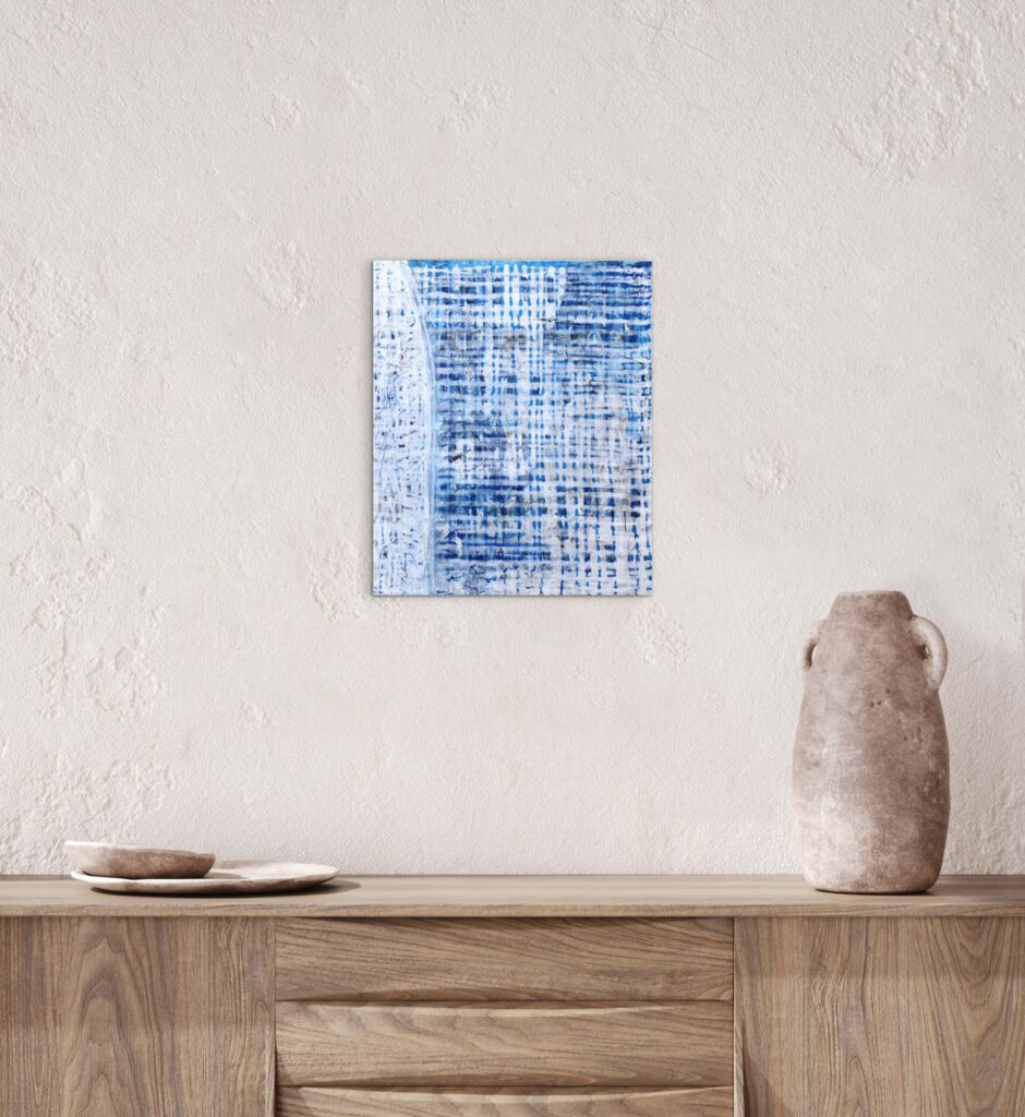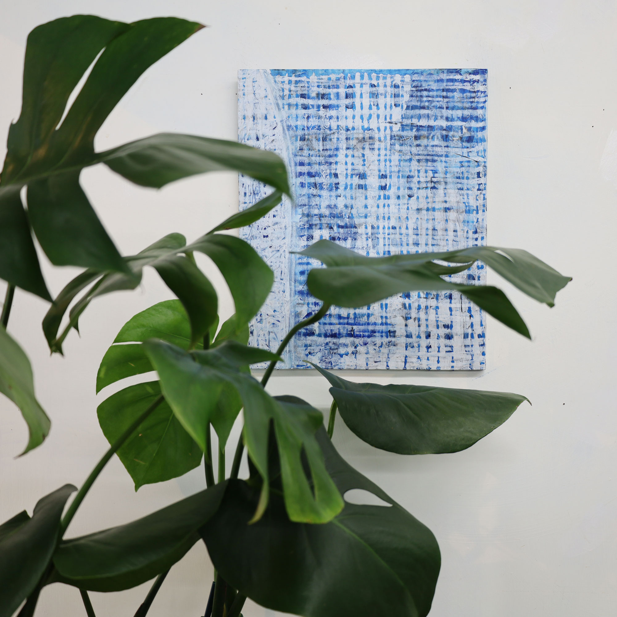 A wandering path that eventually revealed a soft, shimmering check pattern. Vertical blue lines, left to flow naturally, meet horizontal white lines drawn by hand with crayon. In these unsteady, hand-drawn intersections, I feel a sense of gentle comfort and tranquility.