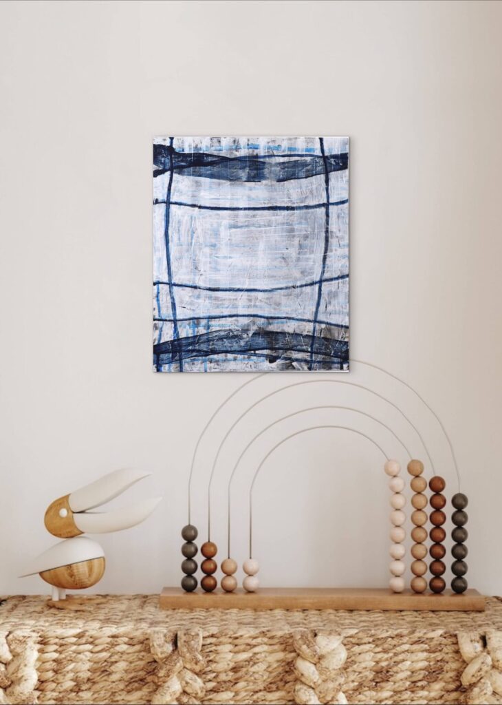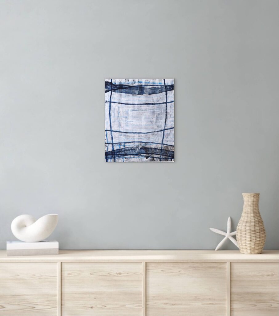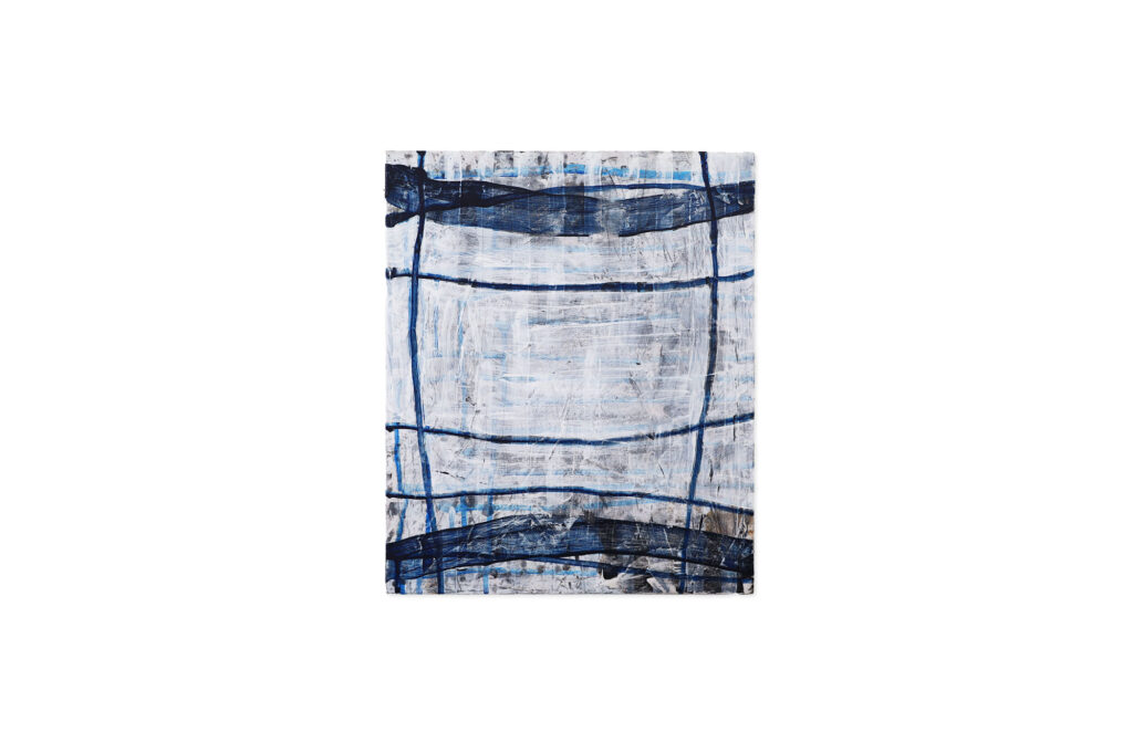 A thick line, as if closing in from top to bottom, and a thin line, attempting to gently expand. These two distinct lines, layered with further imagery upon a surface that was tentatively built, create a tense balance. The artwork is finished with a weathered texture, reminiscent of natural phenomena.
